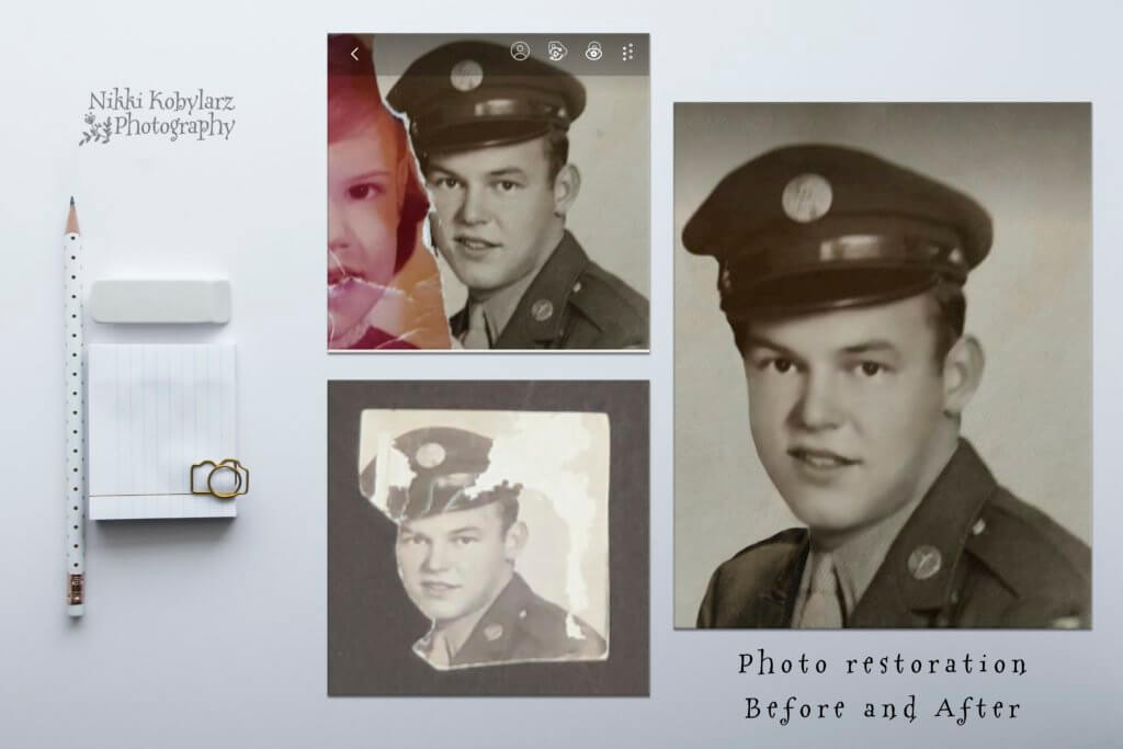 Another photo restoration I am very proud of is of a Client’s father who was in the service. She cherished that photo but it was torn and wearing down quickly. I was able to restore it, piecing it back together. It was a long process but completely worth all the effort to be able to save that image for her.