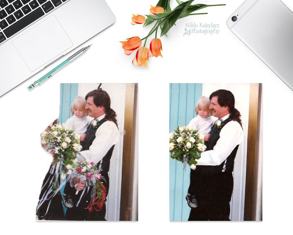 Then there was the image of my younger brother with my dad. The photo, my Dad’s wedding photo where he was holding my brother, was torn and had some other minor damage. It was just a small printed photo from 1995 I saved as a teenager. My brother was getting married last August and I wanted to surprise him with this photo for his wedding. It’s my brother’s favorite photo of him and my dad. We don’t have many photos with our parents so the few we have we cherish (See my blog on why taking photos with your kids is so important). Our dad passed away in February 2016 so this was the perfect gift to give his fiancé. She wanted to make him something special as a wedding gift at their wedding in August 2020. The cuff links she had the photo put on turned out beautifully!